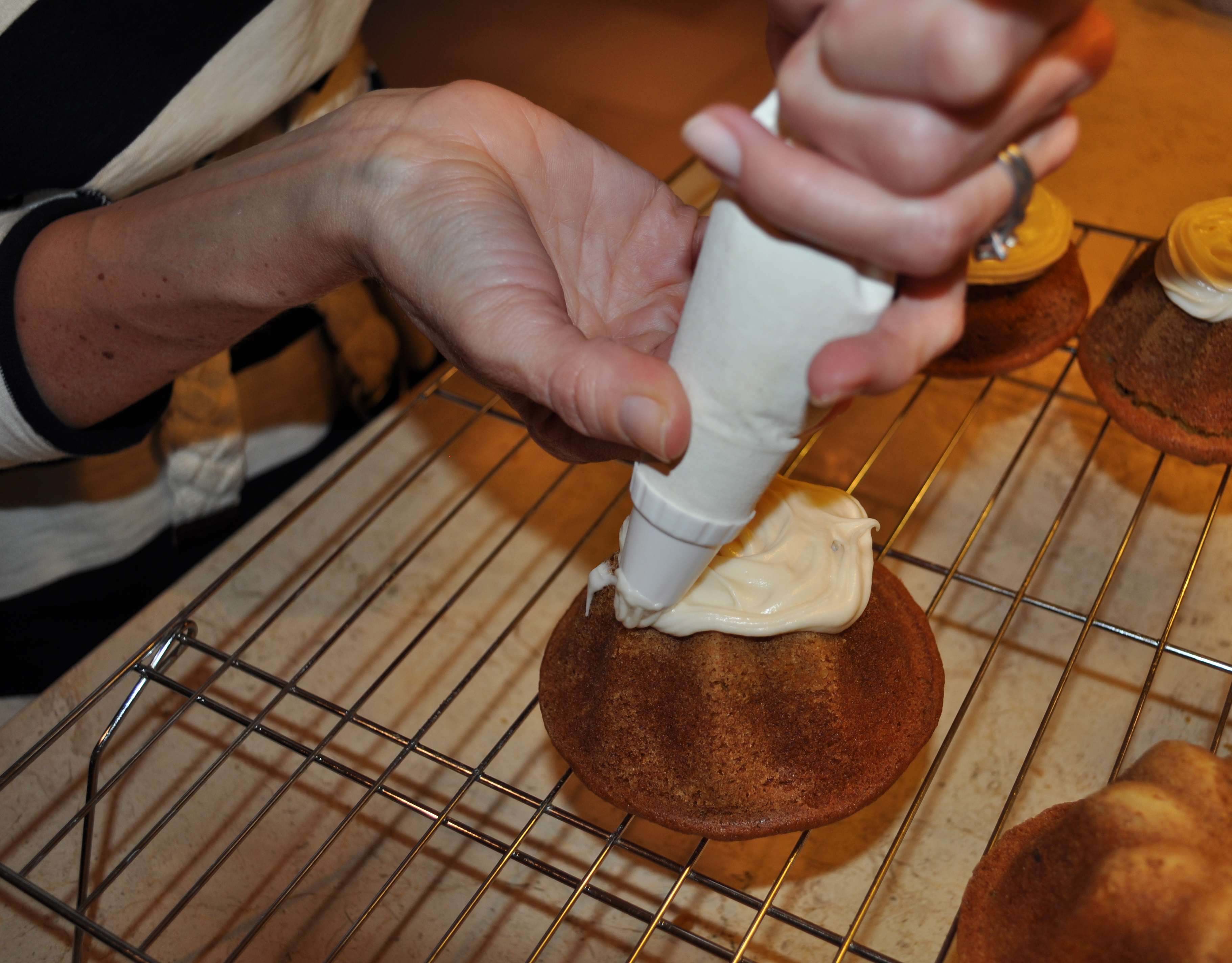 I did my own version of a zingy cream cheese frosting, which contains sour cream, and topped each cupcake with a sprinkle of chopped pecans and a sprinkle of some orange-cinnamon turbinado sugar that I’d made.