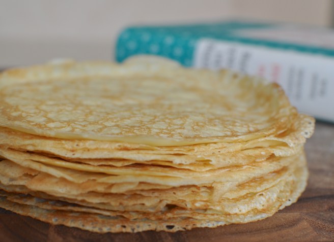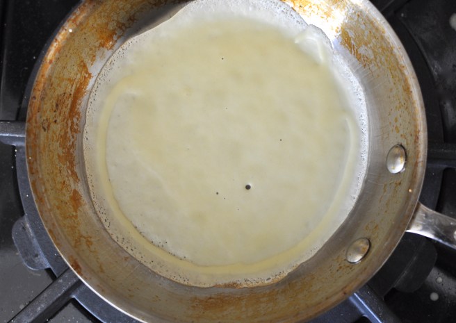 - Place pan back on the heat. When batter sets and underneath is light brown (peek by lifting with a spatula), flip crepe over by tossing or by pulling edge closest to you up and over with your fingers (carefully!). The book says it takes 60-80 seconds for one to reach light brown, but it took ours only 45 seconds. Just keep your eye on it – you’ll know.