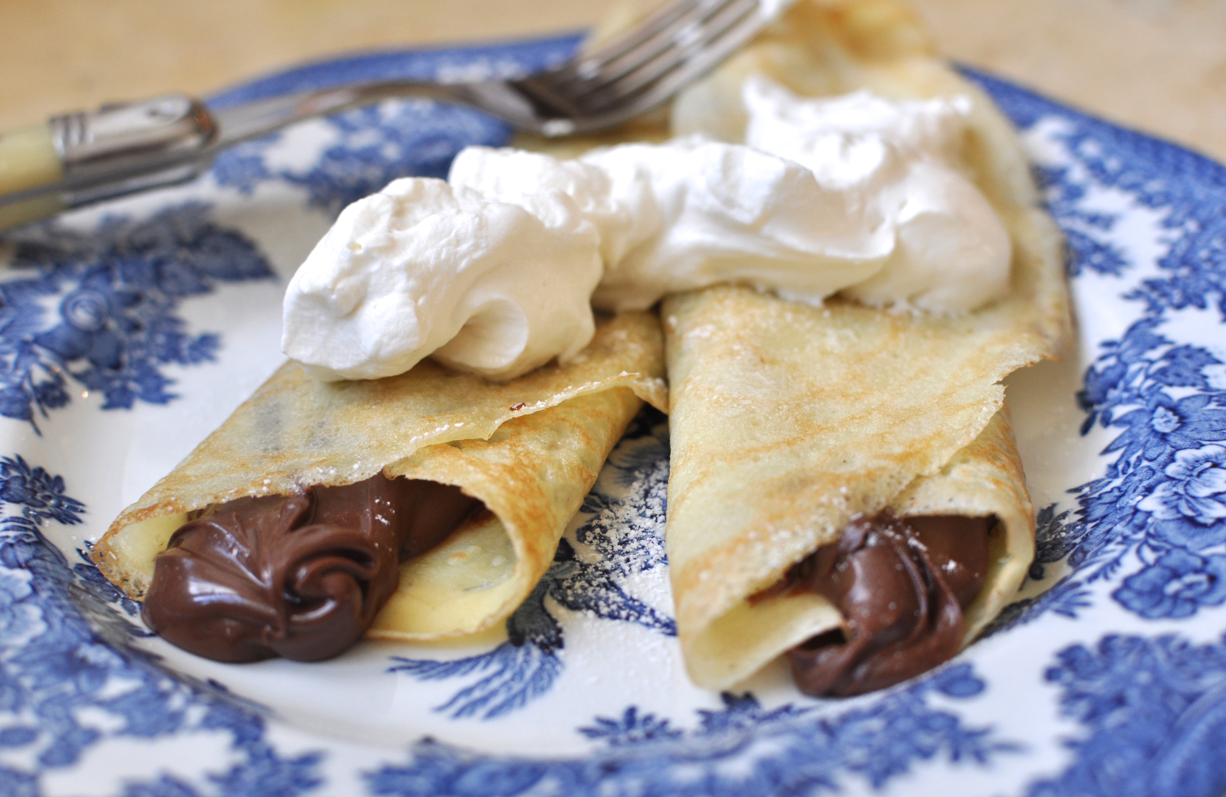 For Nutella crepes, warm a few tablespoons of Nutella in a small bowl in the microwave for 25-30 seconds to soften, then spread on crepes and top with whipped cream and a sprinkle of powdered sugar.