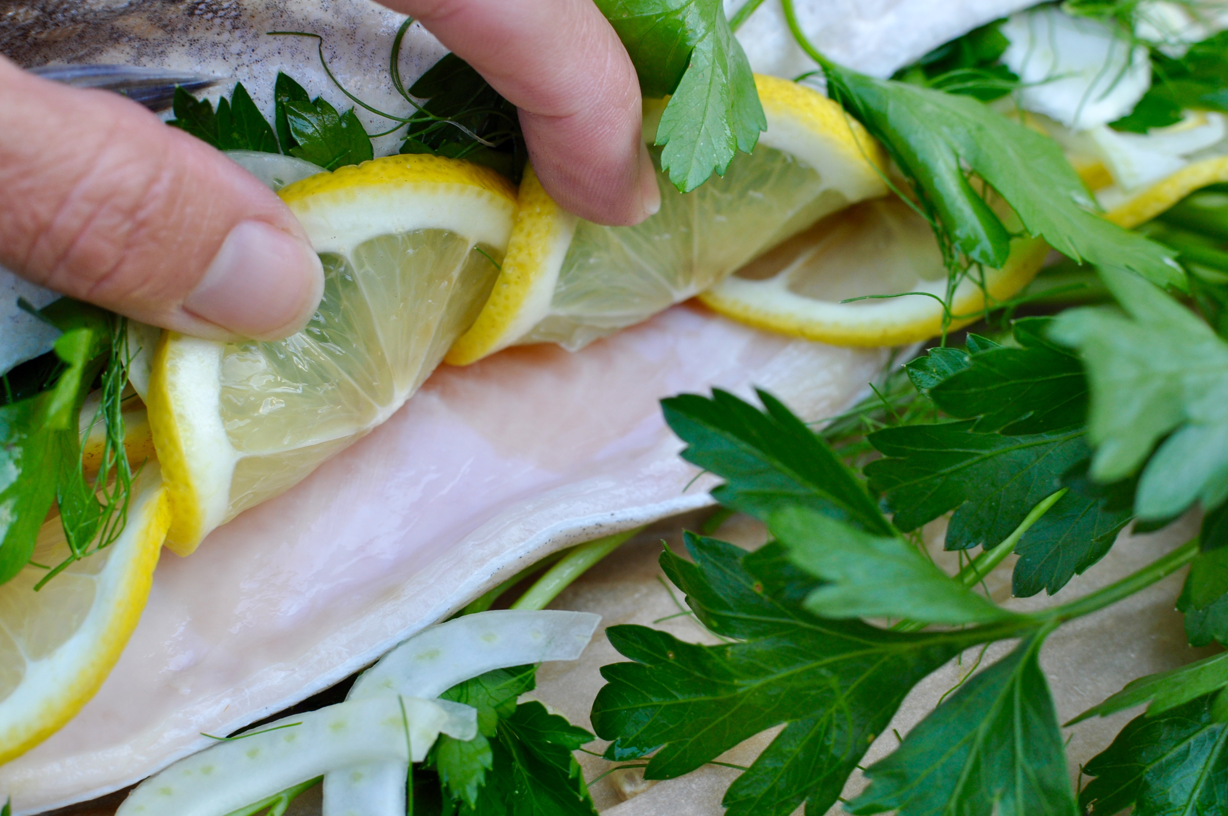 - Rinse the fish and pat dry. Season fish inside and out with kosher salt. Layer lemon slices inside cavity of fish. Scoop sauteed fennel and shallots from olive oil with a slotted spoon and spread evenly in cavity of fish (reserving the oil). Sprinkle chopped parsley and fennel fronds evenly in cavity.